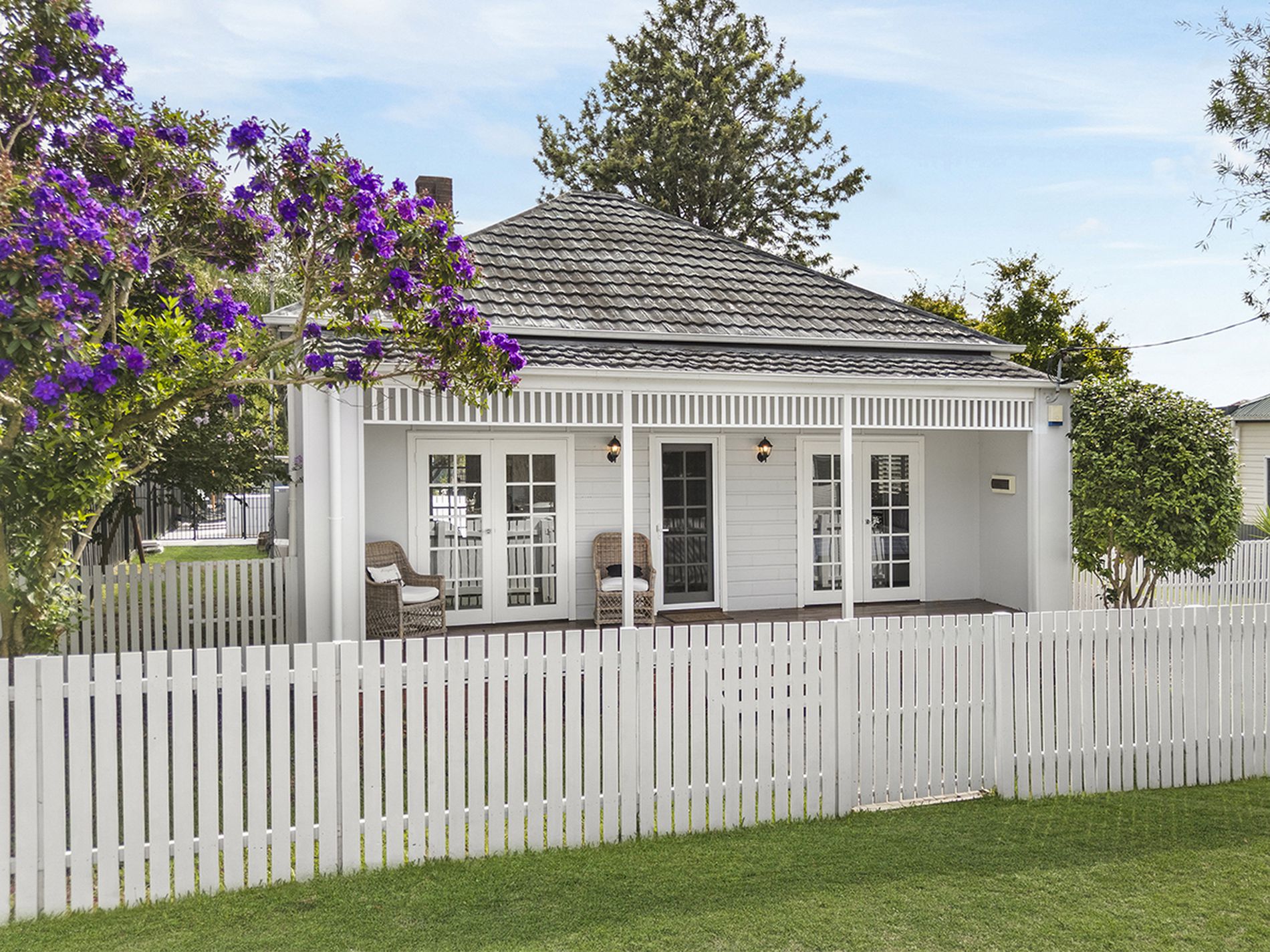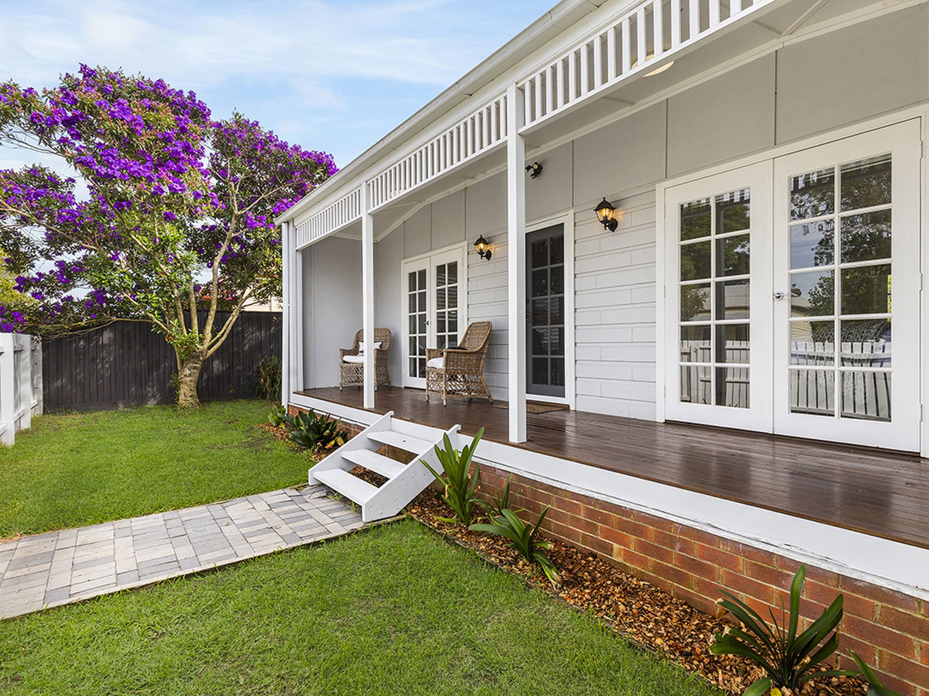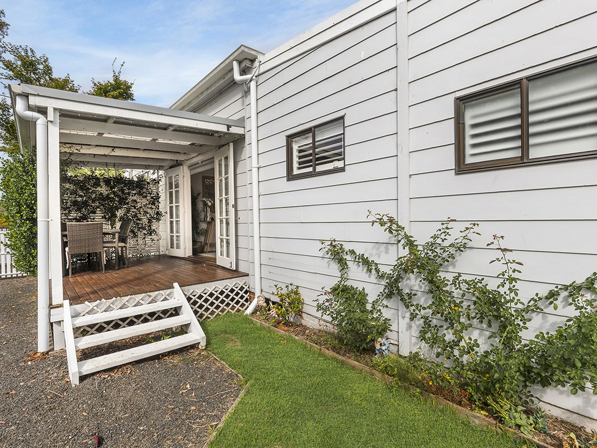 French doors off two bedrooms and the dining area open onto charming timber decks