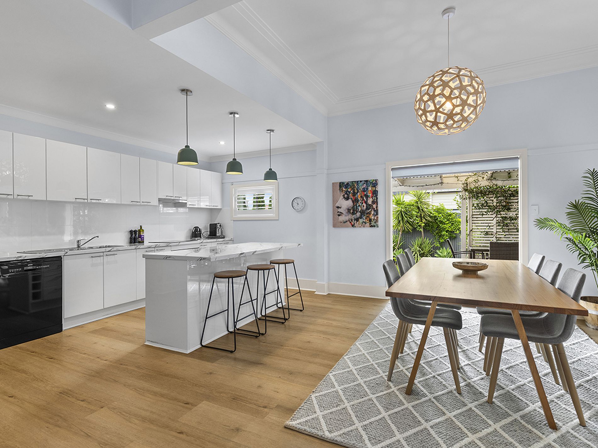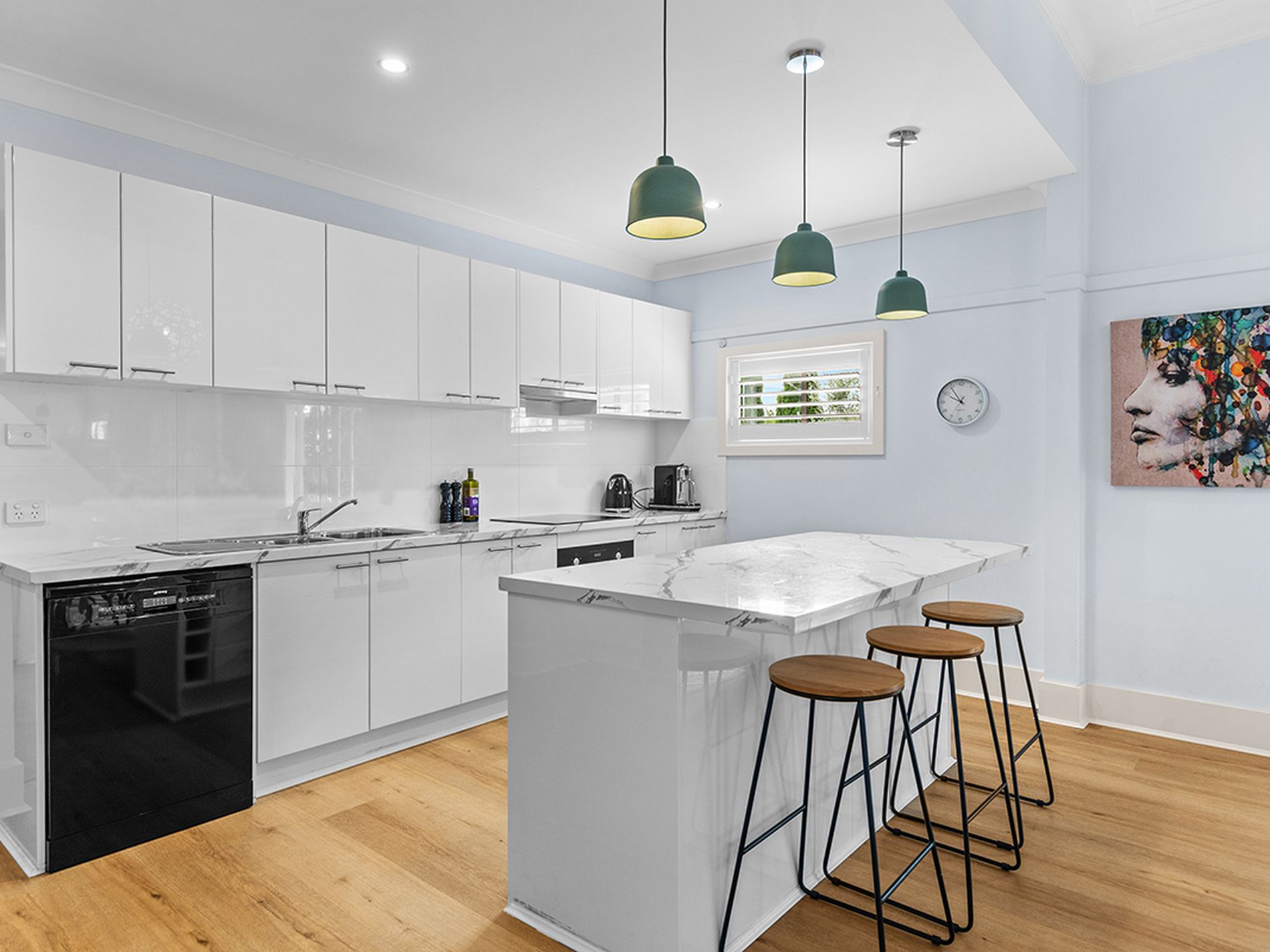 Open plan kitchen with huge island counter, Bosch induction cooktop and Smeg dishwasher